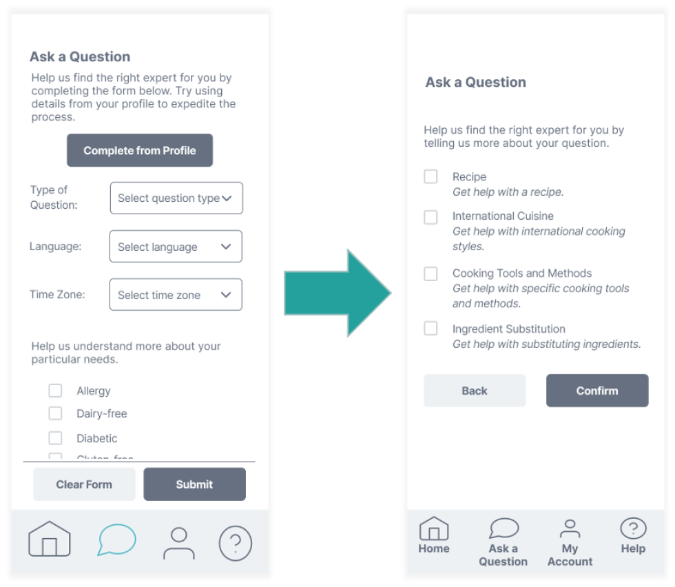 The most popular questions for respondents to ask were about ingredient substitution, temperature and/or cooking time, and technique. Respondents also frequently asked about nutrition and diet. The solution should provide an easy way to ask about these specific topics.