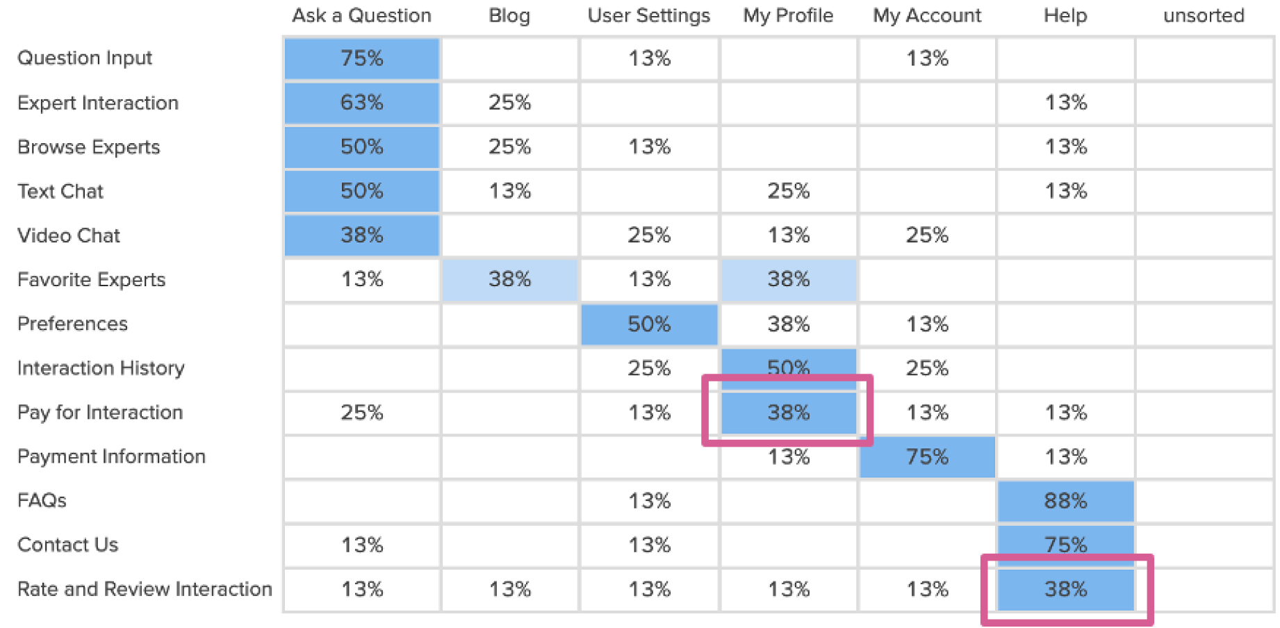 Participants sorted key functions, like “Pay for Interaction” and “Rate and Review Interaction” outside the “Ask a Question” category. It might have helped to provide more context or give pages and subpages more descriptive names. Participants also seemed to have differing ideas about what belongs in the “Blog” category. The most significant observation was how participants sorted the cards under “User Settings", “My Profile,” and “My Account.”