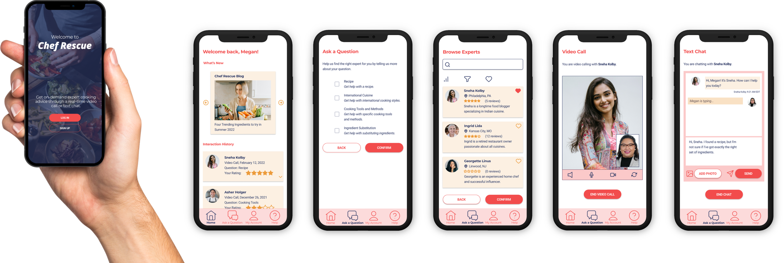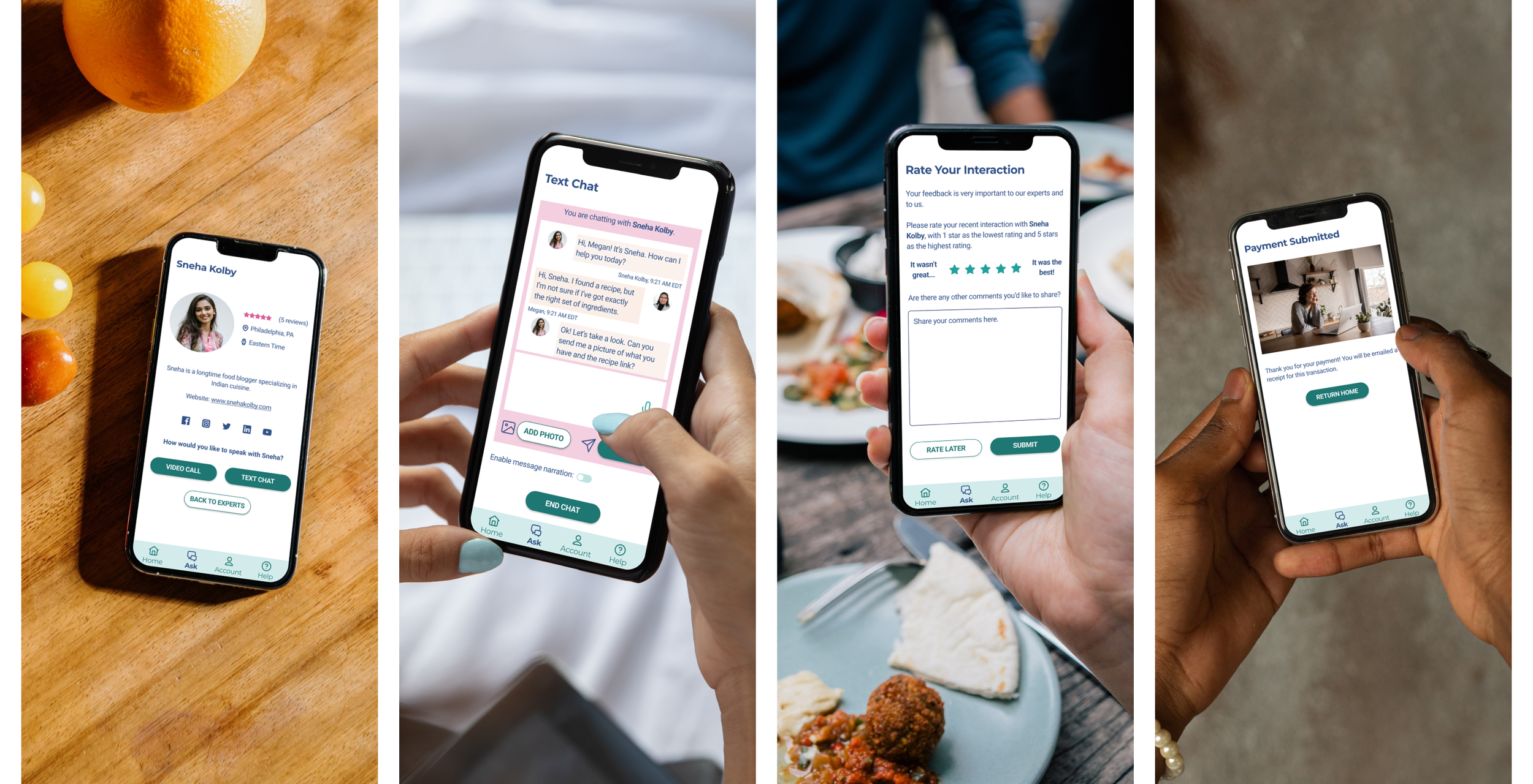 As a student in CareerFoundry’s UX Immersion course, I was tasked with designing a mobile-responsive app that allows users to instantly connect with an expert in a given field. For this project, I chose to focus on the problems faced by home chefs.