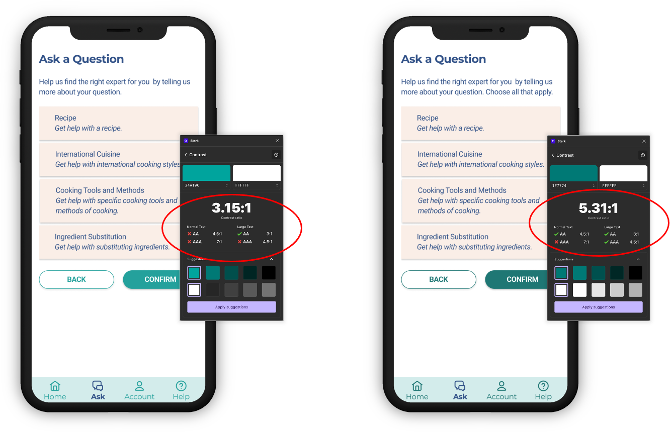 Color scheme is too harsh. Collaborators noted that red evokes a sense of “urgency,” while the use of white text on a red background was described as “jarring.” Based on this feedback, the color palette was redesigned in favor of blue and green. Blue and green are also popular in the food industry and convey freshness and authority.