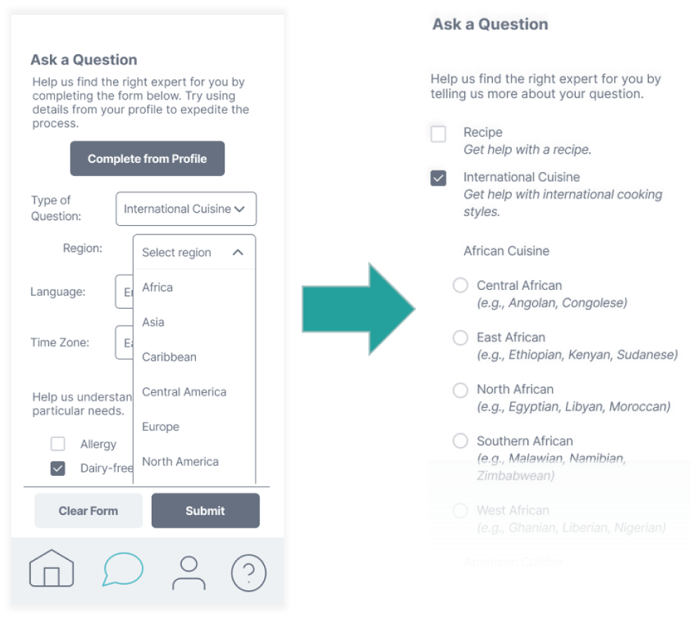 Evidence: Some participants hesitated when working through the “International Cuisine” fields to ask a question. One participant needed guidance to select a continent from the “Region” field before selecting the country.