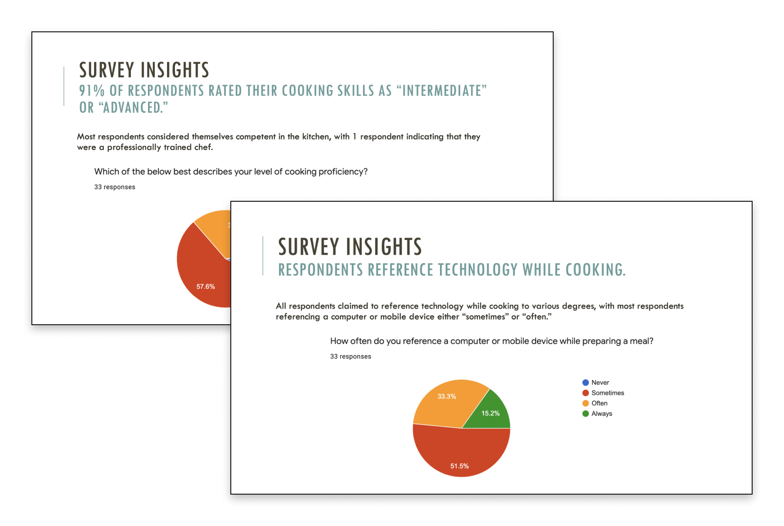 Respondents reference technology while cooking. All respondents claimed to reference technology while cooking to various degrees, with most respondents referencing a computer or mobile device either “sometimes” or “often.” This supports a need for a technological solution users can use while cooking.