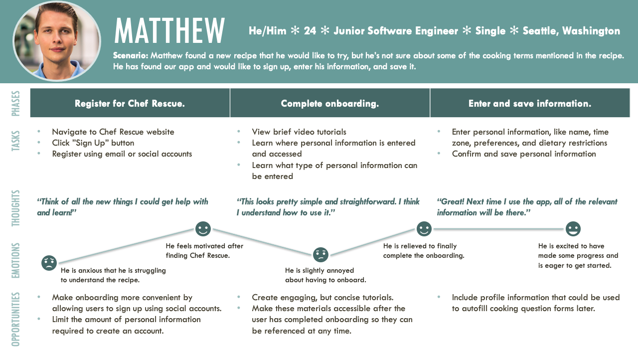 User journeys were created to understand what each persona would go through when completing a task. This includes their thoughts and emotions, which uncovered opportunities to build helpful functionality into the Chef Rescue app.