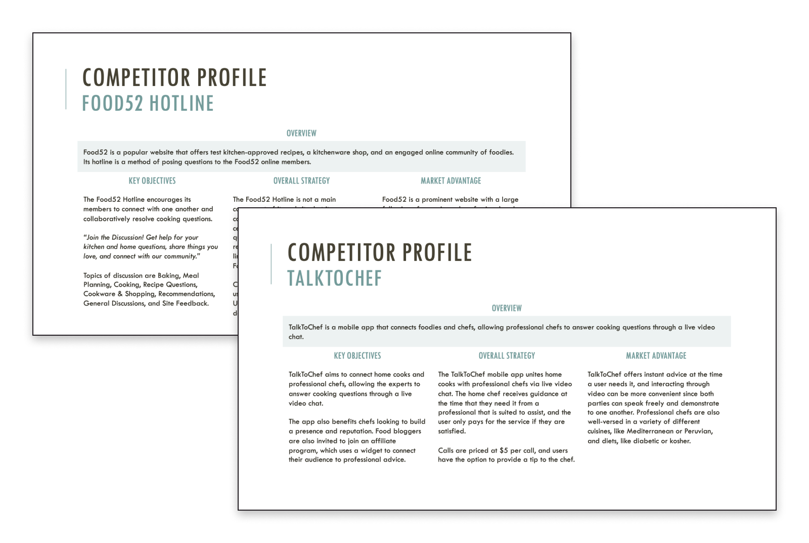 Though resources are plentiful when it comes to seeking cooking advice, many of them focus on static content and have limited interactive elements. Because Chef Rescue aims to provide on-demand and real-time interactions, focus was placed on two competitors offering similar solutions: Food52 and TalkToChef.